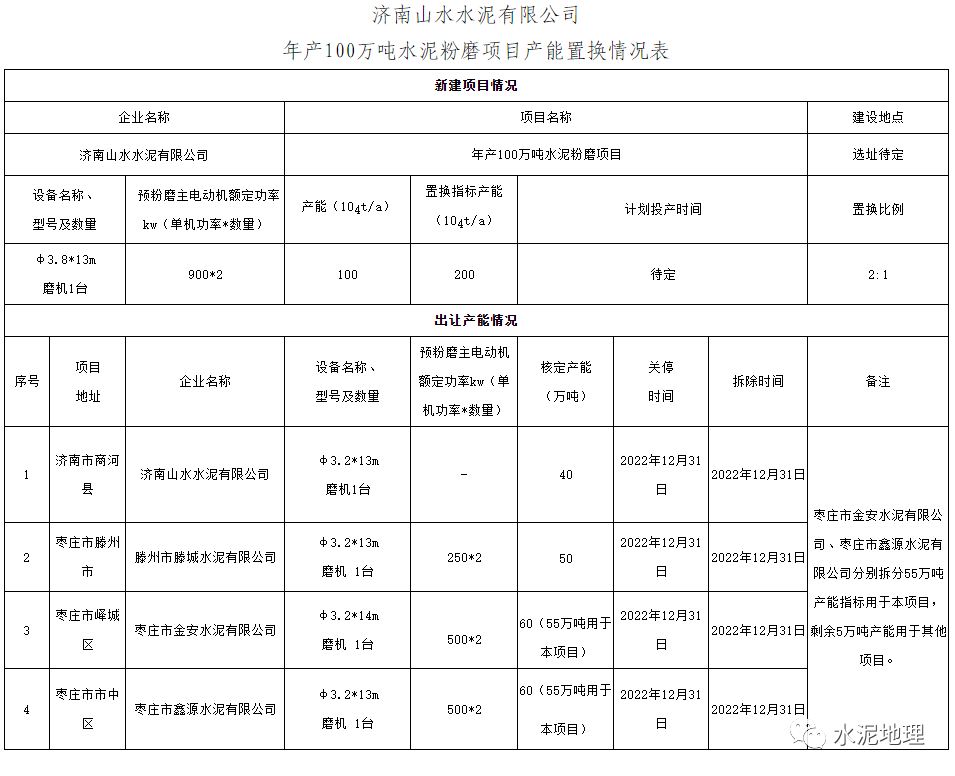 济南山水水泥有限公司年产100万吨水泥粉磨项目将新建一台φ3.8*13m磨机,年产能100万吨,置换指标产能为200万吨/年,置换比例2:1,产能置换详情如下:
