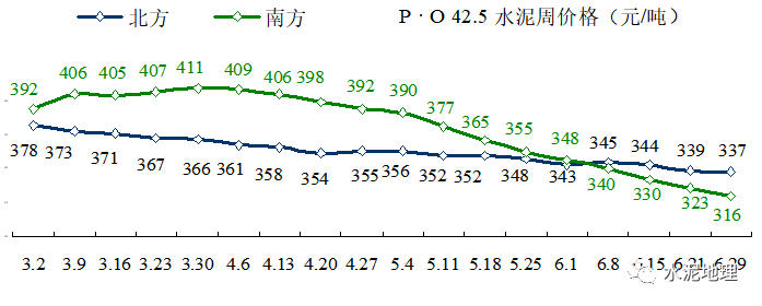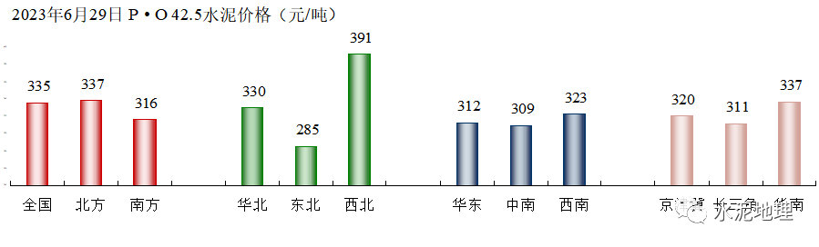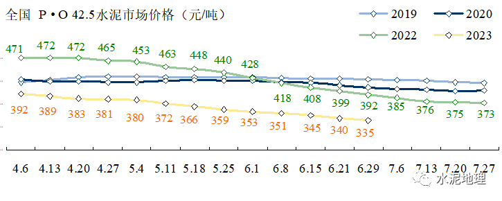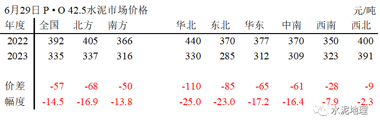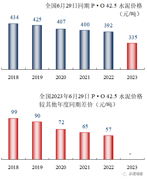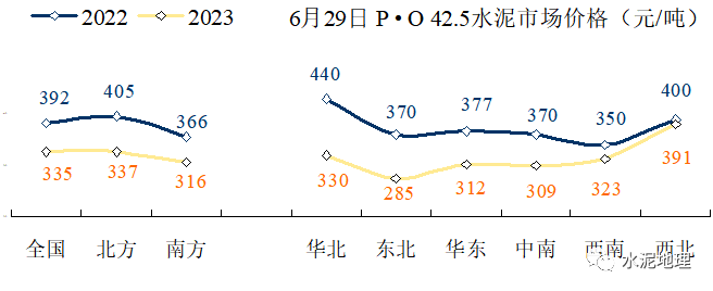6月29日,全国P • O 42.5 水泥价格335元/吨,与2018~2022年同期价格平均价差76元/吨(上周76元/吨)。6、7月份进入雨水天气,往年通常情况下,价格会进一步走低。2023年价格破”400”后,6月再破”340”,很多地区已走低” 330”,8个省会城市跌破300”,沈阳更是逼近200”。![]()