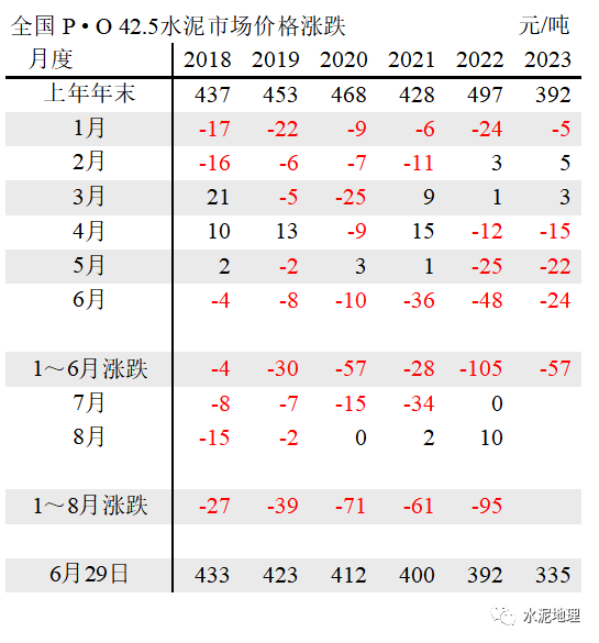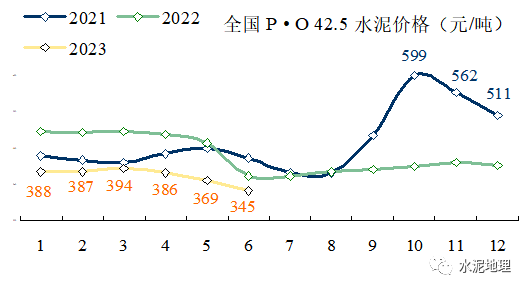 2023年6月29日,全国P • O 42.5水泥市场价格335元/吨,较上周下跌4元/吨。4月以来。价格连降13周,累计下跌60元/吨。2023年1~6月水泥价格运行轨迹,同步2022年同期,淡季拉涨,旺季下跌,如出一辙。不同的是2022年价格在历史高位下跌,2023年价格是低位下跌。7月市场淡季,历史记录,多是价格下跌。![]()