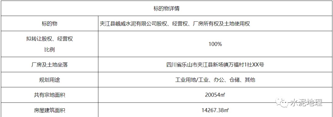 据京东拍卖平台显示,夹江县峨威水泥有限公司股权、经营权、厂房所有权及土地使用权即将拍卖,起拍价为6800万元。保证金680万元,增价幅度10万元及其整数倍。
