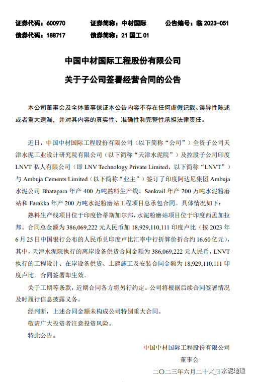 中材国际6月25日公告,近日,公司全资子公司天津水泥院及控股子公司LNVT与Ambuja Cements Limited签订了印度阿达尼集团Ambuja水泥公司Bhatapara年产400万吨熟料生产线、Sankrail年产200万吨水泥粉磨站和Farakka年产200万吨水泥粉磨站工程项目总承包合同。