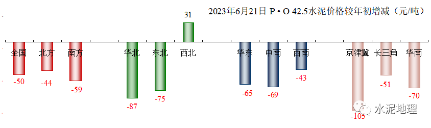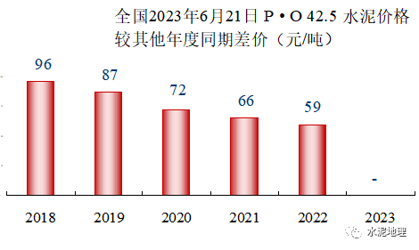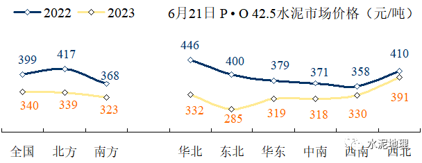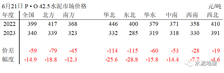2018~2022年是全国价格高位时间段,2023年水泥价格持续快速下跌:全国,2023年6月21日(下同)340元/吨,低于2017年同期;北方,339元/吨,低于2017年同期12元/吨;华东、中南,两个年度价格基本持平,价差在10元/吨之内;价差大的是西北和东北,两地价差正好相反:东北2023年低于2017年108元/吨,西北2023年高出2017年79元/吨。![]()