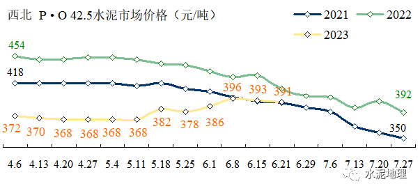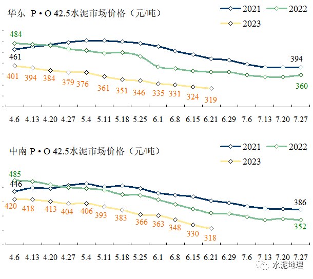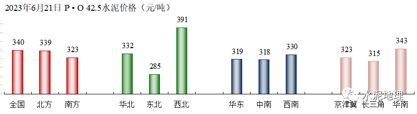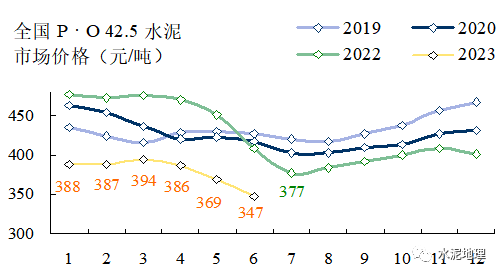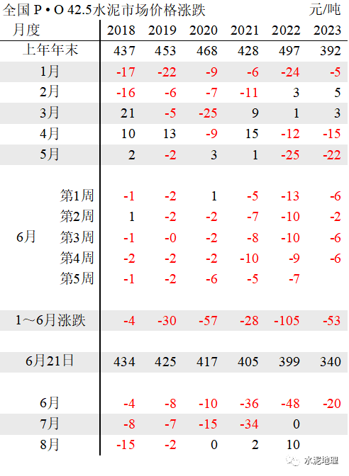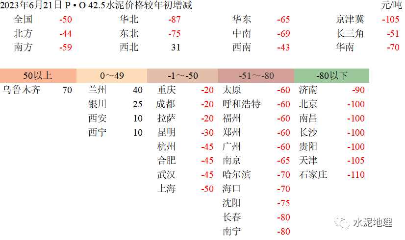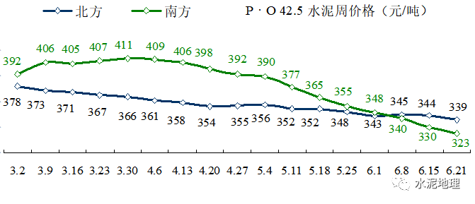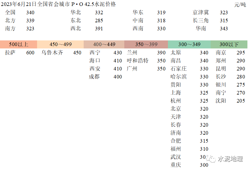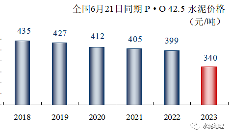 6月21日,全国P • O 42.5 水泥价格340元/吨,与2018~2022年同期价格平均价差76元/吨(上周74元/吨)。6、7月份进入雨水天气,往年通常情况下,价格会进一步走低。2023年价格破”400”后,6月再破”350”,很多地区已走低” 330”,6个省会城市跌破300”,沈阳更是逼近200”。![]()