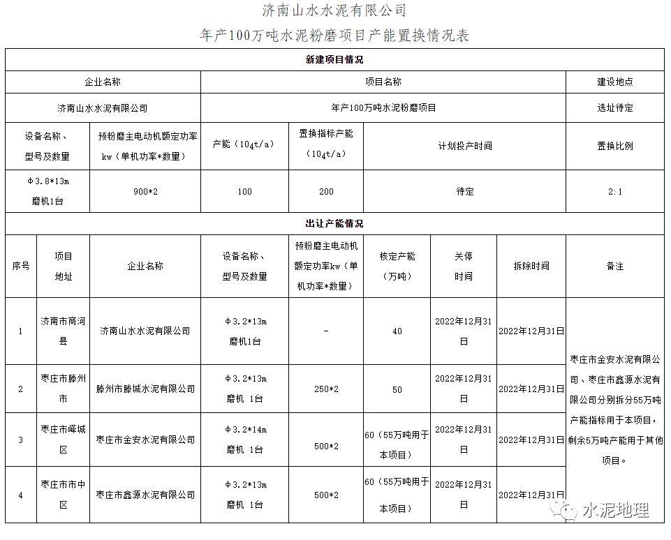 济南山水水泥有限公司拟新建一台φ3.8*13m磨机,年产能100万吨。根据《山东省人民政府办公厅关于加强“两高”项目管理的通知》(鲁政办字〔2021〕57号)、《关于印发坚决遏制“两高”项目盲目发展的若干措施的通知》(鲁政办字〔2021〕98号)和《山东省水泥粉磨产能置换实施办法》(鲁工信原〔2022〕53号)规定,企业制定了产能置换方案,现予公示,欢迎社会公众进行监督。