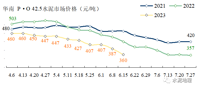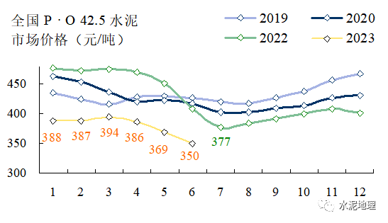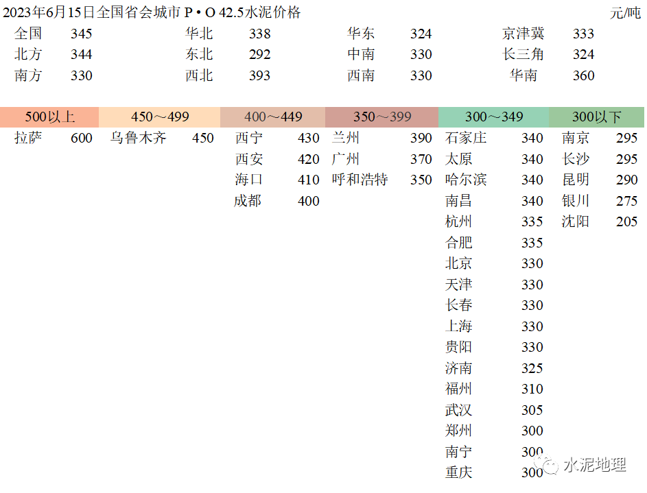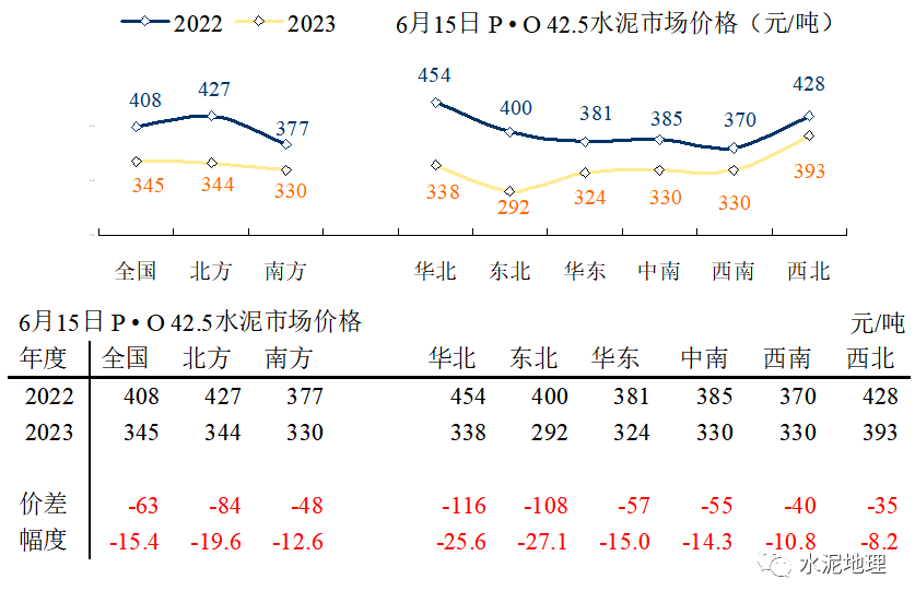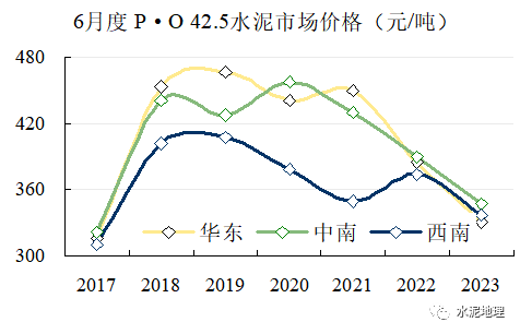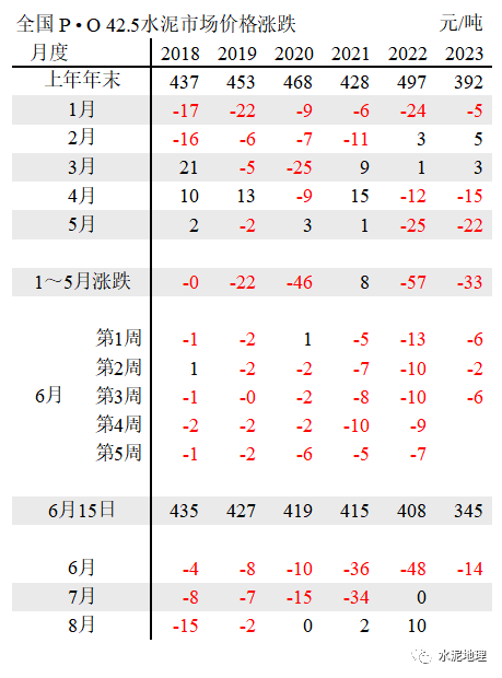 2023年6月15日,全国P • O 42.5水泥市场价格345元/吨,较上周下跌6元/吨。3月价格见顶后,连降14周,累计下跌51元/吨。2023年1~6月水泥价格运行轨迹,同步2022年同期,淡季拉涨,旺季下跌,如出一辙。不同的是2022年价格在历史高位下跌,2023年价格是低位下跌。6、7月,市场淡季,历史记录,多是价格下跌。2022年7月价格见底,8月反弹。![]()