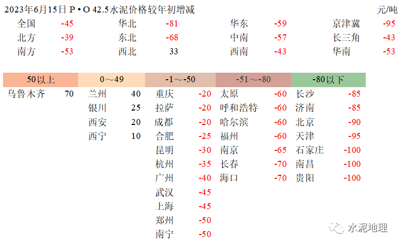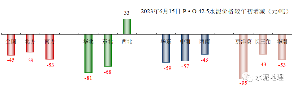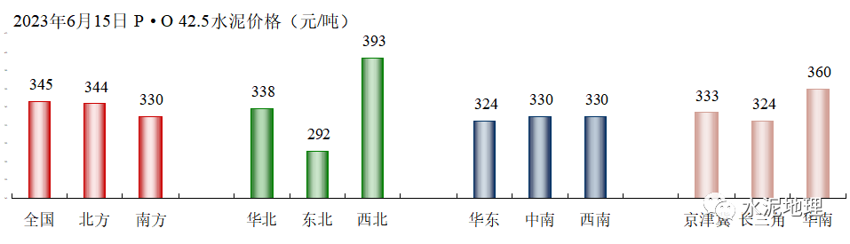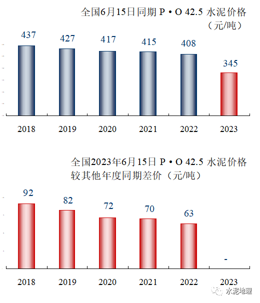 6月15日,全国P • O 42.5 水泥价格345元/吨,与2018~2022年同期价格平均价差76元/吨(上周74元/吨)。6月份即将进入雨水天气,往年通常情况下,价格会进一步走低。2023年价格破”400”后,6月再破”350”。![]()