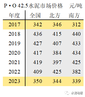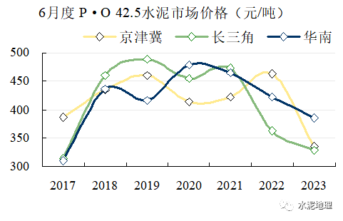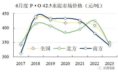 全国,2023年6月价较2017年同期略高8元/吨;北方,低于2017年同期2元/吨;南方,高于2017年同期27元/吨。三地2023年6月价格低于2018~2022年同期均价72、61、83元/吨。2023年或将告别持续5年的水泥市场价格高位期。![]()