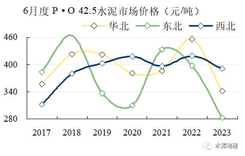 华北,2023年6月价较2017年同期低15元/吨;东北,低于2017年同期100元/吨;西北,高于2017年同期80元/吨;。三地2023年6月价格低于2018~2022年同期均价73、105、12元/吨。西北,价格表现强劲,大幅高于2017年,略低于2018~2022年同期。东北,价格’M”走势,高起高落,2023年价格283元/吨,为同期最低点。华北,2023年价格341元/吨,为2017年以来同期最低点。![]()