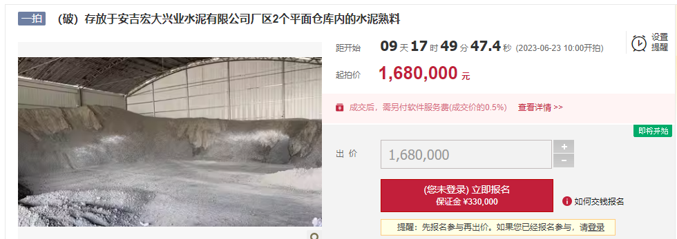 相关信息显示,存放于安吉宏大兴业水泥有限公司厂区2个平面仓库内的水泥熟料即将进行拍卖,起拍价168万元。