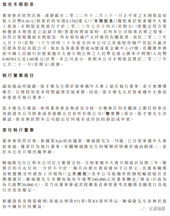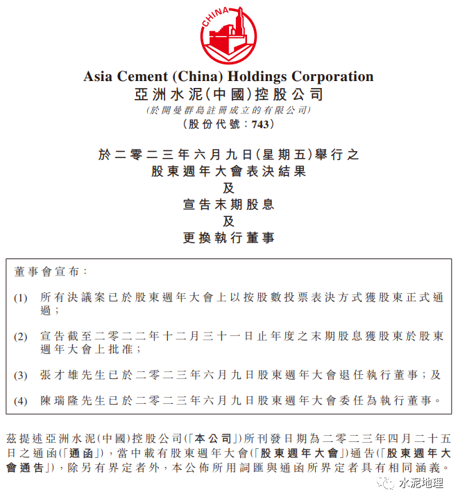 亚洲水泥(中国)(00743.HK)公告,张才雄已于2023年6月9日股东周年大会退任执行董事;陈瑞隆已于2023年6月9日股东周年大会委任为执行董事。