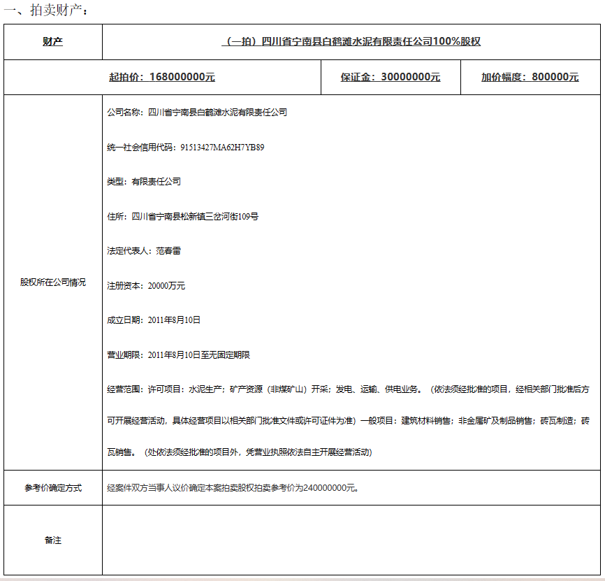 起拍价1.68亿元!四川一水泥企业100%股权拍卖