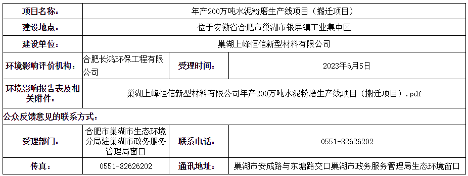 近日,安徽巢湖市生态环境分局同意受理巢湖上峰恒信新型材料有限公司《年产200万吨水泥粉磨生产线项目(搬迁项目)》将受理情况予以公示。
