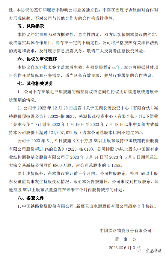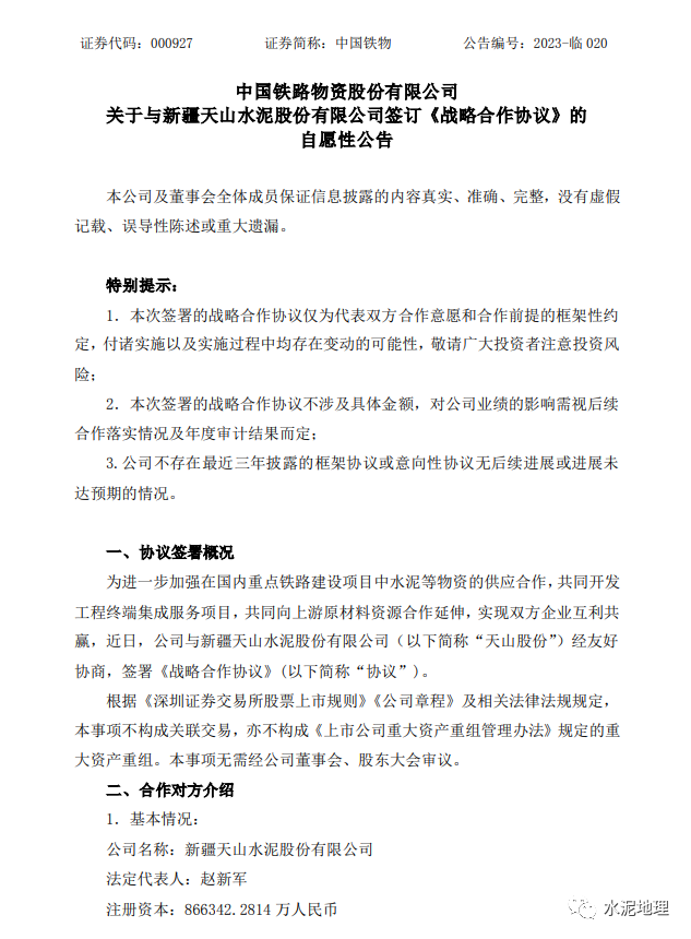 中国铁物6月2日晚间发布公告称,为进一步加强在国内重点铁路建设项目中水泥等物资的供应合作,共同开发工程终端集成服务项目,共同向上游原材料资源合作延伸,近日,公司与新疆天山水泥股份有限公司签署《战略合作协议》。双方拟围绕产品供应与服务、重点工程合作、合作搭建物流运营平台等方面开展合作,通过政策互通、联合规划、产业合作、共同开发等方式实现优势互补、深度合作、互利共赢。
