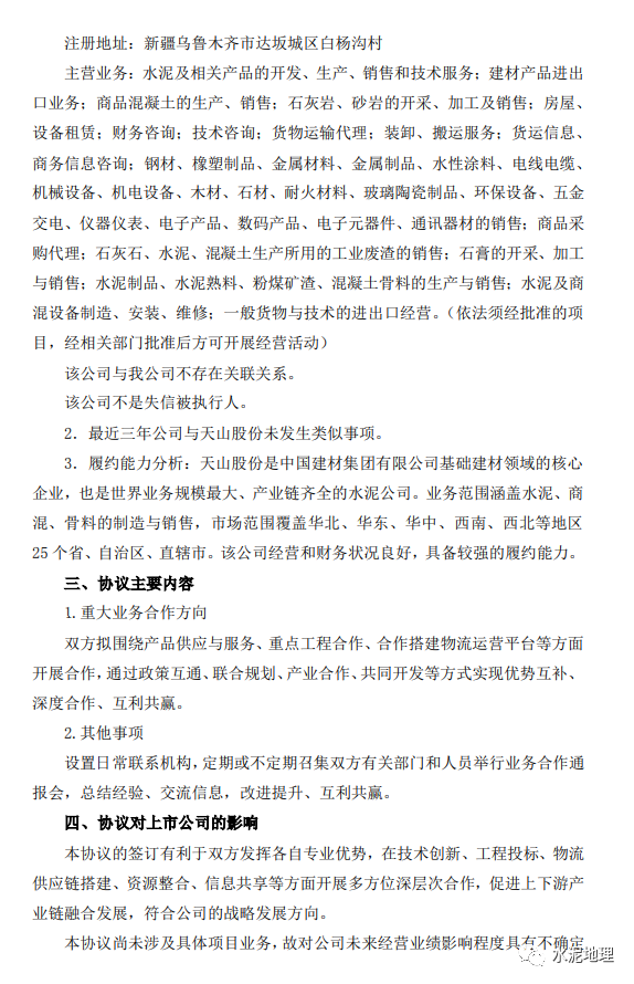 公告中提到:天山股份是中国建材集团有限公司基础建材领域的核心企业,也是世界业务规模最大、产业链齐全的水泥公司。业务范围涵盖水泥、商混、骨料的制造与销售,市场范围覆盖华北、华东、华中、西南、西北等地区25 个省、自治区、直辖市。该公司经营和财条状况良好,具备较强的履约能力。
