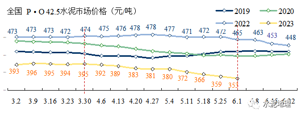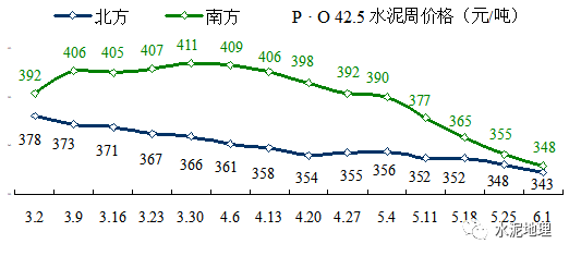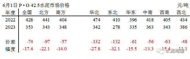 2023年6月1日,全国P • O 42.5水泥市场价格353元/吨,较上周再跌6元/吨。自进入4月,连降9周,累计下跌42元/吨。跌:哈尔滨 30元/吨,南京25元/吨,太原、南昌20元/吨,沈阳、杭州15元/吨,天津、石家庄、长春、福州、济南、武汉、重庆、贵阳 10元/吨,郑州、长沙 5元/吨。![]()