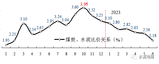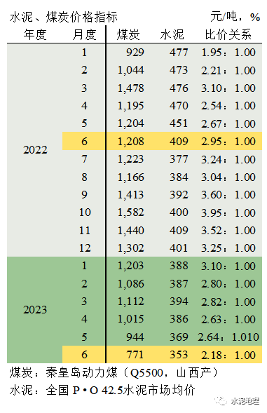 煤炭、水泥比价关系,2022年10月达到3.95:1.00,随后走低,2023年5月,2.56:1.00,略低于2022年同期2.67:1.00。6月,2.18:1.00,大幅低于2022年同期2.98:1.00。6月1日,煤炭价格跌破800元/吨。![]()