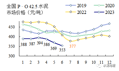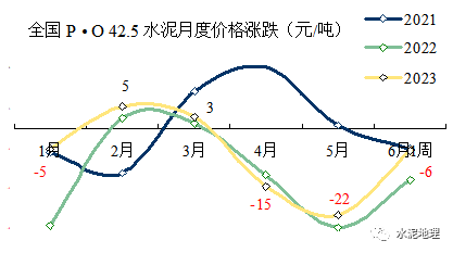 2023年1~6月水泥价格运行轨迹,同步2022年同期,淡季拉涨,旺季下跌,如出一辙。不同的是2022年价格在历史高位下跌,2023年价格是低位下跌。6、7月,市场淡季,历史记录,多是价格下跌,今年水泥市场价格形势严峻。![]()