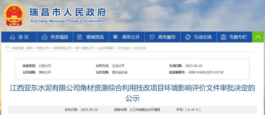 近日,江西省九江市瑞昌生态环境局发布江西亚东水泥有限公司角材资源综合利用技改项目环境影响评价文件审批决定的公示。