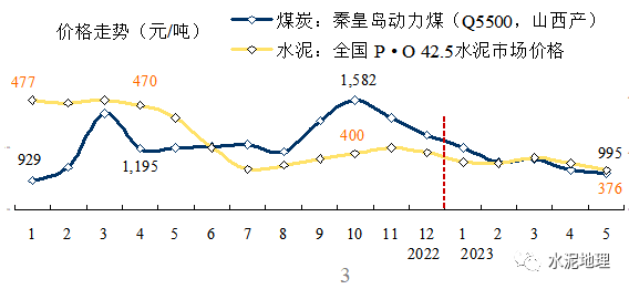 2023年煤炭、水泥价格有所变化,5月煤炭价格995元/吨,较去年同期下降17.39%,水泥价格376元/吨,下降17.86%,水泥价格下降幅度持平煤炭。![]()