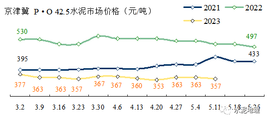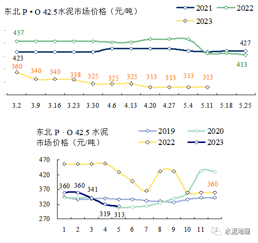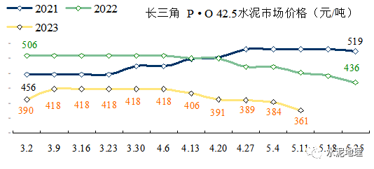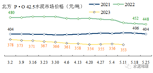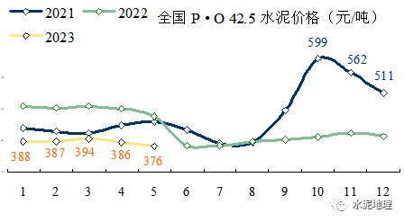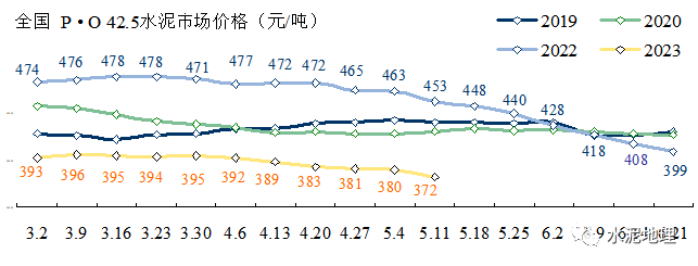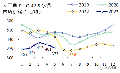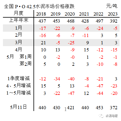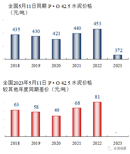 5月11日,全国P • O 42.5 水泥价格372元/吨,与2018~2022年同期价格平均价差64元/吨(上周56元/吨)。4、5两月是水泥传统旺季,价格涨多跌少,今年重蹈去年覆辙。不同的是,去年高位下降,今年是低位下降。![]()