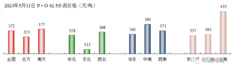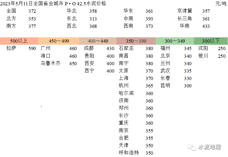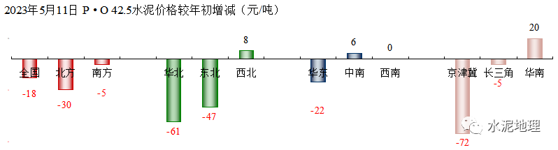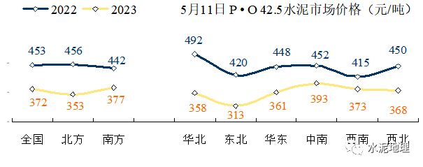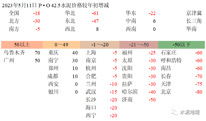 2023年5月11日,全国水泥价格372元/吨,较年初下降18元/吨;南方水泥价格377元/吨,较年初下降5元/吨;北方水泥价格353元/吨,较年初下跌30元/吨。南方中南和北方西北价格较年初增长,西南持平,华东和北方华北、东北下跌;华南涨幅20元/吨,长三角下跌5元/吨,京津冀地区价格大幅下跌72元/吨。![]()