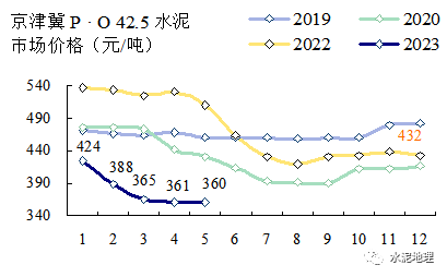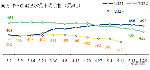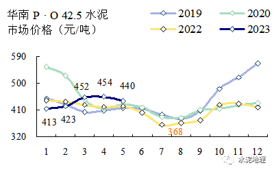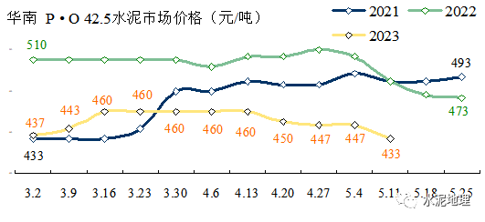 华南,2023年3月以来连续5周高位横盘460元/吨后,连续4周走弱,下调27元/吨,幅度小于长三角。5月均价440元/吨,高于年初27元/吨,全国水泥价格表现最好的地区,唯一价格在400元/吨以上地区。![]()