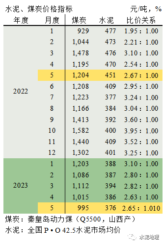 煤炭、水泥比价关系,2022年10月达到3.95:1.00,随后走低,2023年5月,2.65:1.00,略高于2022年同期2.67:1.00。4月25日,煤炭价格破1000元/吨,仍有进一步下降空间。![]()