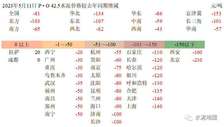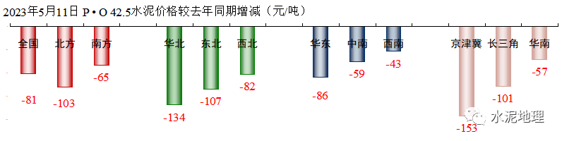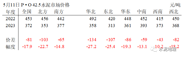 2023年5月11日,水泥价格较去年同期大幅回落。北方下跌幅度远远大于南方。南方回落65元/吨,北方回落103元/吨。南方,华东下跌幅度最大86元/吨,西南下跌最低43元/吨;京津冀下跌153元/吨,长三角101元/吨,华南下跌57元/吨。![]()