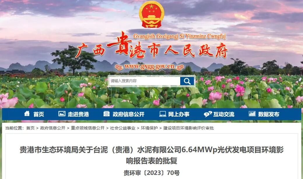 5月4日,广西贵港市生态环境局发布关于台泥(贵港)水泥有限公司6.64MWp光伏发电项目环境影响报告表的批复。