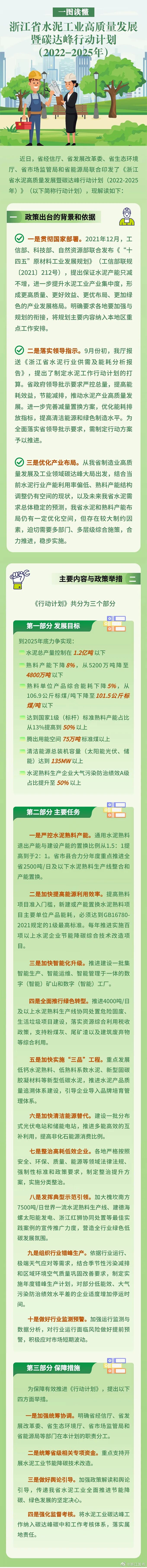 浙江省省经信厅等五部门近日联合印发《浙江省水泥高质量发展暨碳达峰行动计划(2022-2025年)》,提出到2025年底,力争实现水泥总产量控制在1.2亿吨以下;熟料产能下降8%,从5200万吨降至4800万吨以下;腾出用能空间75万吨标准煤以上;水泥熟料生产企业大气污染防治绩效A级占比提升至50%以上。本文件自6月1日起实施。