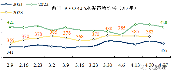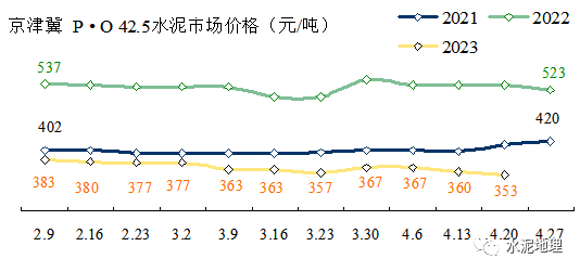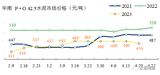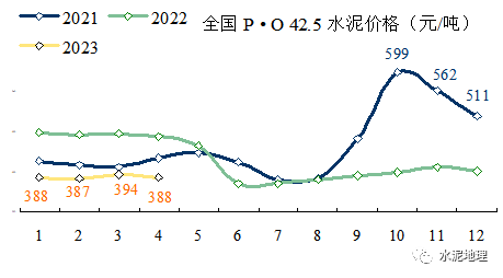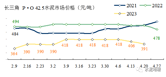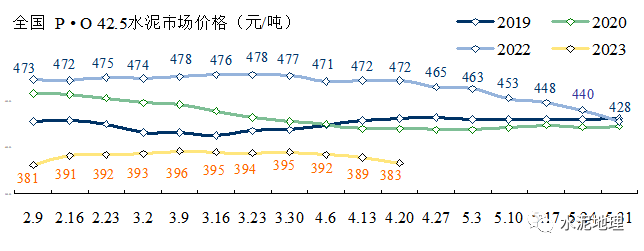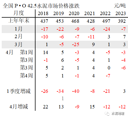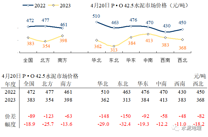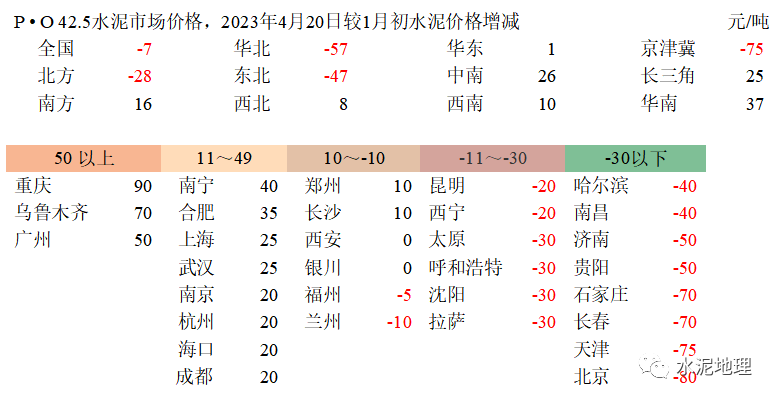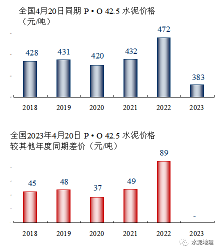 本周4月20日,10跌。延续上周价格继续下跌,区域范围进一步扩大。广州、海南、长三角四地,都出现价格松动,表明市场疲软具有普遍性。4月20日,全国P • O 42.5 水泥价格383元/吨,与2018~2022年同期价格平均价差54元/吨(上周46元/吨),价差进一步扩大。与2022年差价89元/吨。4、5两月是水泥传统旺季,价格涨多跌少,上半年基建需求支撑强度、地方工程项目资金到位程度,意外情况发生概率(主要是雨水),是影响水泥价格的主要因素。2023年4月份,市场表现差强人意,反应在价格晴雨表上。![]()