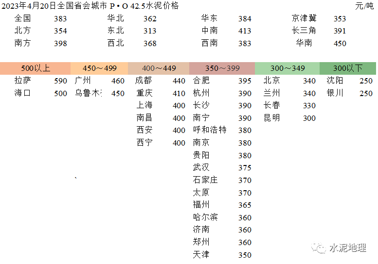 2023年4月20日,全国P • O 42.5水泥市场价格383元/吨,较上周下跌6元/吨。4月水泥价格连降3周,合计下降13元/吨,回到今年价格最低水平。跌:长春 30元/吨,石家庄、上海、合肥、广州2元/吨,南京、杭州、海口、贵阳、西安10元/吨,沈阳、福州、武汉5元/吨。![]()