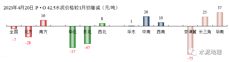 2023年4月20日,水泥价格回到2022年前状态,南强北弱。南方水泥价格398元/吨,较年初增长16元/吨,北方水泥价格354元/吨,较年初下跌28元/吨,南北方价格一增一跌,价差44元/吨。华南、长三角涨幅37、25元/吨,所属地区价格都为增长。京津冀地区价格大幅下跌75元/吨;重庆、广州、乌鲁木齐、合肥涨幅最高,50~90元/吨;![]()