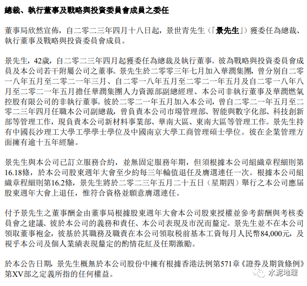 景世青先生(「景先生」),42岁,自二零二三年四月起获委任为总裁及执行董事。彼为战略与投资委员会成员及本公司若干附属公司之董事。景先生于二零零三年七月加入华润集团,曾分别自二零一八年五月至二零二一年三月、自二零一八年五月至二零二一年五月及自二零一八年八月至二零二一年五月担任华润集团人力资源部副总经理、本公司非执行董事及华润燃气控股有限公司的非执行董事。彼于二零二一年五月加入本公司,曾自二零二一年五月至二零二三年四月任职本公司副总裁,曾负责本公司市场管理部、智能与数字化部、科技创新部等管理工作,现负责本公司新材料事业部、华南大区、东南大区等管理工作。景先生持有中国长沙理工大学工学学士学位及中国南京大学工商管理硕士学位。彼在企业管理方面拥有逾十五年经验。