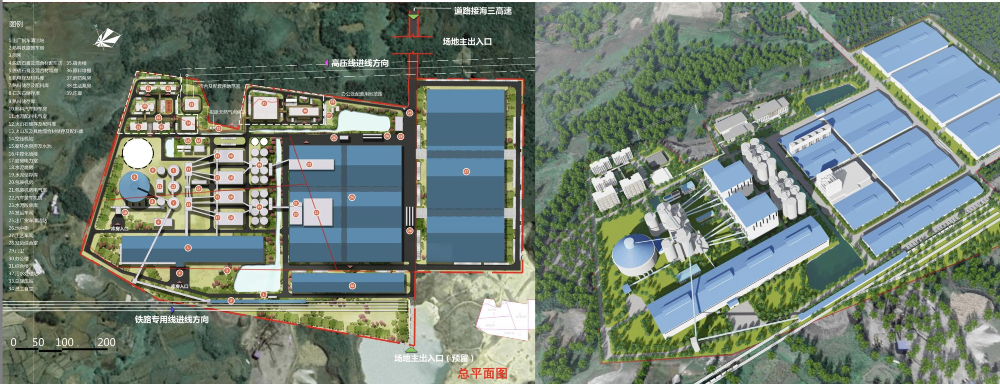 生产区包含水泥粉磨生产线、绿色新型建材生产基地、混凝土搅拌站、城市废弃物处理及资源综合利用中心、原料仓储基地、物流配送;生活配套包含生活及后勤保障等相关配套设施;办公及科技研发区包含研发、展示、销售、科普中心、行政办公。