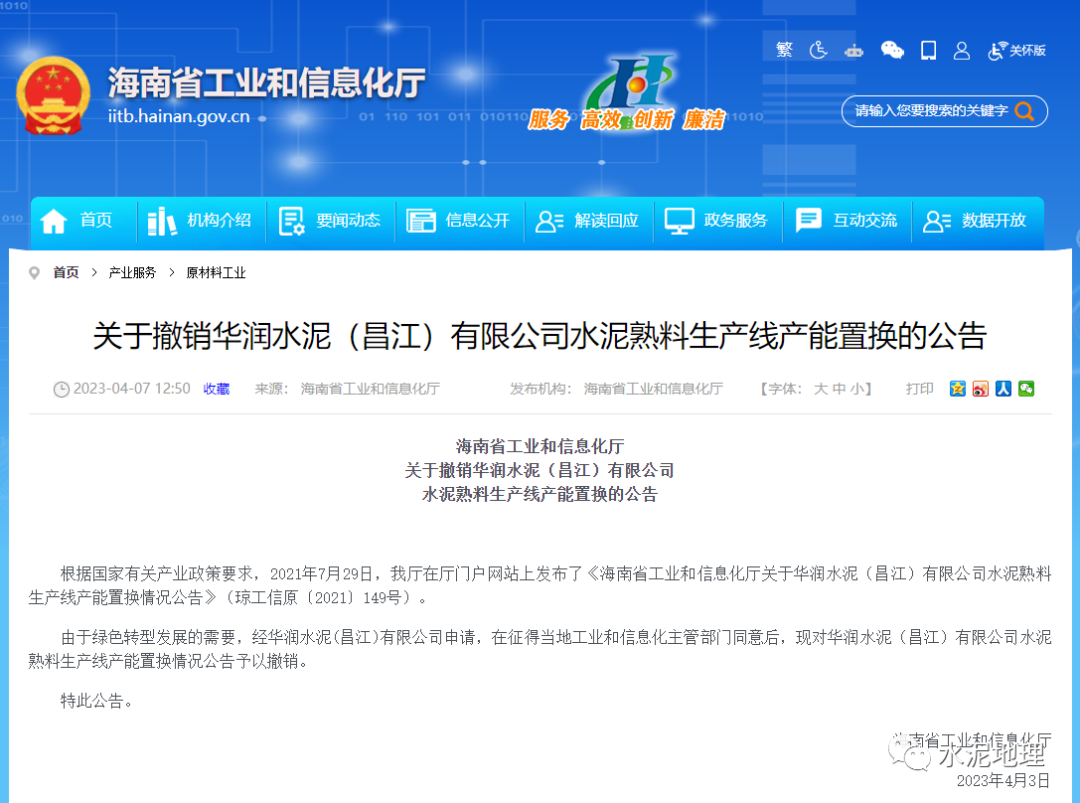 华润水泥昌江熟料产能置换情况公告撤销