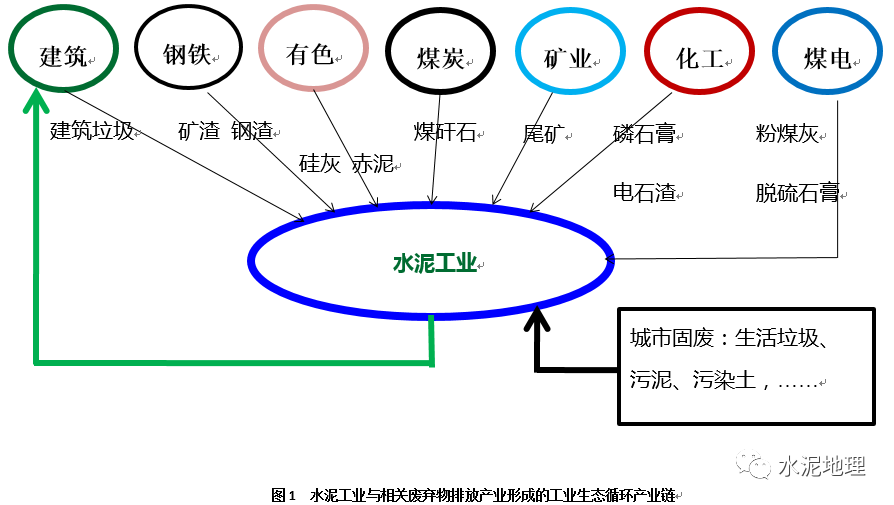 水泥工业综合利用工业固体废物的历史悠久。有多少工业产业的固废要依赖水泥工业和水泥制品产业安全处置和资源化综合利用呢?实在太多,笔者无法作全面统计,尤其是各种工业过程产生的危险废弃物,但是图1中所列出的相关产业已足够令人有一个大观。据2010年的数据,水泥工业固废利用已占全国固废利用量的30%左右。一些业内外人士认为水泥工业利废是理所当然,其实不然。水泥生产利用可燃废物,最初是因为国家能源短缺时降低水泥产品生产能耗的需要。水泥熟料生产有着严格的生料化学组分设计、成分波动范围和熟料产品质量控制要求,从系统稳定生产和质量控制上来说,组分变化或波动较大、所含微量元素不同和浓度高低、废物性能差异较大的各种工业固废的利用,均会对水泥生产过程和产品质量带来影响,需要通过研发,采取相应的技术措施加以协同和消除影响。可以说,每一种废弃物的利用都必须研发相应的控制技术,水泥工业的环保功能是建立在科技创新的基础之上。