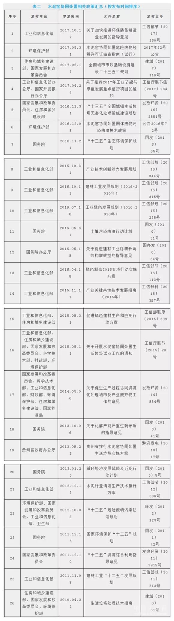 从2010年至2017年,与水泥窑协同处置相关的国务院和部委发布的政策已达26项之多(表二)。这些直接和间接支持水泥窑协同处置的政策创新和政府主管部门的直接推动,加快了水泥窑协同处置的创新发展。但遗憾的是,水泥窑协同处置企业迄今仍然不能享受国家对生活垃圾处置的财政补贴。其实,在市场机制下,他们真正需要的是公平竞争环境。笔者相信,长风破浪会有时,不用多久,水泥窑协同处置生活垃圾一定会成为政府不可或缺的好帮手。