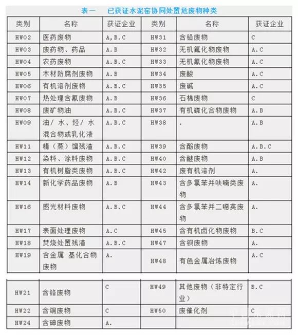 表一  已获证水泥窑协同处置危废物种类 注:按2008年版《国家危险废物名录》归类。A:金隅集团,B:华新水泥,C:海螺水泥