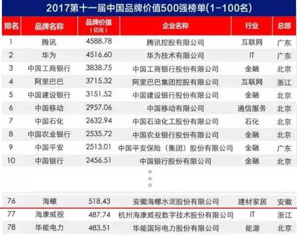 海螺品牌价值518亿!名列2017中国品牌价值500强第76