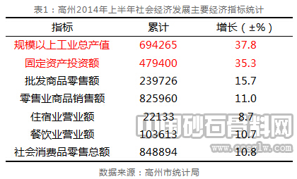上半年,高州社会经济发展表现稳中向好,投资性增长明显快于消费性增长,但经济活动总体表现远超国家平均水平。其中规模以上工业快速稳步发展,前6月,规模以上工业总产值累计69.43亿元,同比实现37.8%的超高速增长,比国家8.8%和广东省8.2%的增速分别高出29和29.6个百分点;固定资产投资较快发展,上半年,固定资产投资累计实现47.94亿元,增长35.3%;消费类市场平缓发展,上半年累计实现社会消费品零售总额84.89亿元,增长10.8%。从区域社会经济全局来看,属于典型的“投资性市场为主,消费型市场为辅”的结构搭配,这种经济结构特征对于建设砂石的具有很强的拉动效应,活跃的投资建设活动会直接刺激建设砂石的需求的快速增长,进而会促进整个高州地区砂石行业的发展。