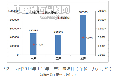 上半年,高州市实现生产总值185.0亿元,按可比价计算,比上年同期增长10.6%,其中第一产业49.21亿元,增长4.8%;第二产业45.14亿元,增长16.8%;第三产业90.65亿元增长7.9%。从产业分布比例来看,第三产业半年度产值接近工农业产值之和,而就增速分析,第二产业增速遥遥领先于一、三产业,其同比增长速度逼近第一产业数值的四倍。显然,高州地区产业结构特征是以第三产业为主导,反向带动一二产业发展的,有别于多数地区“先工后农再服务”的一般规律,而由此对建设砂石需求也会呈现出“现行基量不大,增量急速上扬”的伴生规律。