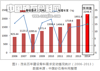 茂名市建设砂石骨料总需求扩张速度较快,7年时间,由2006年900多万吨增加到近2000万吨(2013年),年平均增速为13.5%,从历史数据来看,虽然建设砂石增速总体保持“快进”模式,但2008年和2011年建设砂石也出现过负增长现象,分别为-2.5%、-0.6%,其背后原因在于受08年金融危机牵连,实体建设工程大面积停滞,而随后的“四万亿”刺激计划又将原本处于萧条中的经济直线拉升,但短期余温过后,2011年陷入动力不足状态,部分因刺激上马建设项目成了半拉子工程,停滞不前。随着经济企稳回暖,茂名建设砂石市场需求也开始恢复稳定,并保持一定增速,依据固定资产投资和社会经济建设情况,笔者预计茂名市2014年建设砂石增速有望突破15%,需求总量可达2200万吨左右,其中高州地区增速将高于全市平均水平,建设砂石总需求量预计在300-500万吨之间。