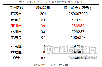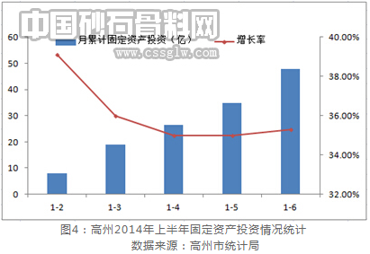 重点工程项目建设投资作为建设骨料需求的主要推手,对建设骨料发展的拉动效果明显。“十二五”期间,茂名市规划建设重点项目达369个之多,计划投资额度超过3000亿元,其中高州市规划重点项目数量排在市域辖区第一位,总投资额度接近100亿元。而今年以来,高州市坚持加快交通基础设施建设、促进产业园区扩能增效、推动中心城区扩容提质“三大抓手”,实现经济的平稳增长。随着城市建设、基础设施建设发展规模的扩大,投资项目不断涌现,高州市在去年实现“七路一桥一中心”的基础上,今年又大力实施“六路一河两公园”等九项重点建设工程,促使固定资产投资呈现稳步发展的态势。截至上半年,高州市固定资产累计投资额47.94亿元,增长35.3%。与此同时,受高速增长的投资建设活动影响,建设砂石需求出现阶段性放量递增现象。
