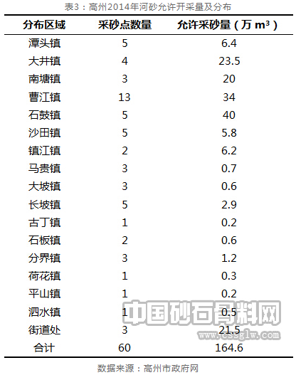 高州先天丰富的天然砂石资源(主要指河砂)长期以来为区域内的发展建设作出了长足的贡献,而依靠传统落后的生产方式获取砂石几乎遍布了全市各个乡镇,据2012年高州市水政监察部门摸底统计结果显示:高州共有采砂点92个,其中持证采砂68个,无证采砂24个。随着建设砂石市场的持续升温,河砂开采演变为疯狂的资源掠夺,非法开采、乱采滥挖,一方面加速了河砂资源枯竭,另一方面给河流生态环境造成巨大的破坏,近两年,市政府对破坏性采砂行为不断开展监督整治,并开展了“三打两建”专项行动,取得了一定的效果。但过度依赖河砂开采的用砂模式不能从根本上消除无序采砂带来的连锁生态危害,从今年政府批准的采砂标段数量来看,全市境内河砂开采点达60处之多,遍及17个乡镇,最小开采规模才0.1万方,最大的也不超过15万方,开采总量高达164.6万方,说明政府并没有从根本上解决“全民采砂”的问题,而“全民采砂”的背后是全民参与生态环境破坏。(详见下表3)