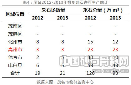 从茂名地区建设砂石供应来看,建设用砂主要来自于境内河砂开采,而建设用碎石则是依赖人工生产的机制碎石。茂名市国土资源局相关信息披露,鼎盛时期,市域内大小合法非法采石场多达300家左右,但这一数量在2010年被削减至60多家,然而市物价监测中心公布的信息来看,2012年和2013年拥有生产许可证的正规采石场仅仅只有19家和21家,且年生产碎石总量在100万方附近徘徊,若将无证在采的石场产量纳入统计,实际数值要远远高于100万方。以高州为例,2013年境内采石场拥有许可证的为5家,合计产量48万方,但无证开采、证件过期开采的石场数量就超过十家,保守估计非法生产量也远超过48万方的合法开采数量。