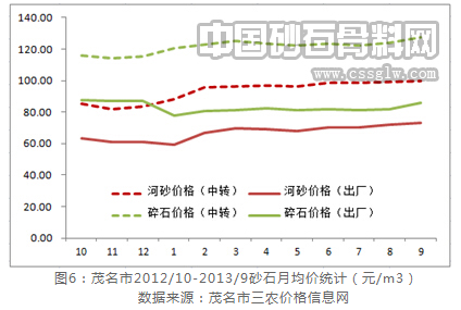近年来,建设砂石作为基础性建设原材料越来越受到地方政府的重视,其供需及价格波动对地方基础建设影响也日益深化,为及时掌握砂石价格变动情况,茂名市物价局选取了100个具有代表性的砂石价格监测点,对市域内砂石价格实时监测,从2012年10月份到2013年9月份12个月的统计结果来看,碎石的稳定出厂均价超过70元/m3,河砂的稳定出厂均价超过60元/m3,而中转价格出现了平均20元左右的溢价。其中河砂最低价格出现在2013年1月59.15元/m3,而最高价格出现在2013年9月73.2元/m3,两者差价幅度为23.75%;碎石最低价格出现在2013年1月78.01元/m3,而最高价格出现在2012年10月87.83元/m3,两者差价幅度为12.59%,原因是春节前后部分建设工程处于“休眠期”,若刨去春节前后影响因素,区域砂石价格总体波动较为平稳,基本上保持在±3%的合理区间浮动。