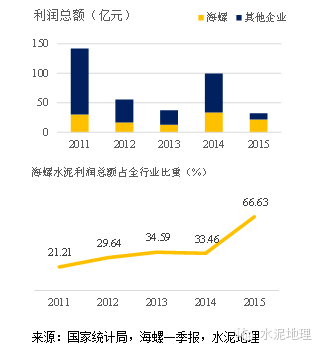 2015年一季度水泥制造业行业利润32.3亿元,而海螺水泥利润总额为21.5亿元,占全行业的2/3,而前两年一季度海螺水泥占行业利润总额比重约为1/3。