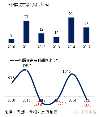 2015年,受房地产下行,基建资金限制等制约,水泥市场启动力度远远不足,平台期来临。而在市场低迷中,海螺水泥的利润水平经验也出现下调,但抗周期波动能力远领先于行业。