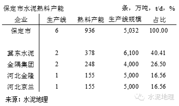 保定市共有生产线6条,熟料产能936万吨,四家企业,除河北京兰及顺平金强水泥外,冀东水泥在涞水县永阳镇布局1条7200t/d线,唐县1条5000t/d线,熟料产能378万吨/年;金隅集团则是在曲阳县灵山镇1条5000t/d线和在易县1条3000t/d线,熟料产能248万吨/年。